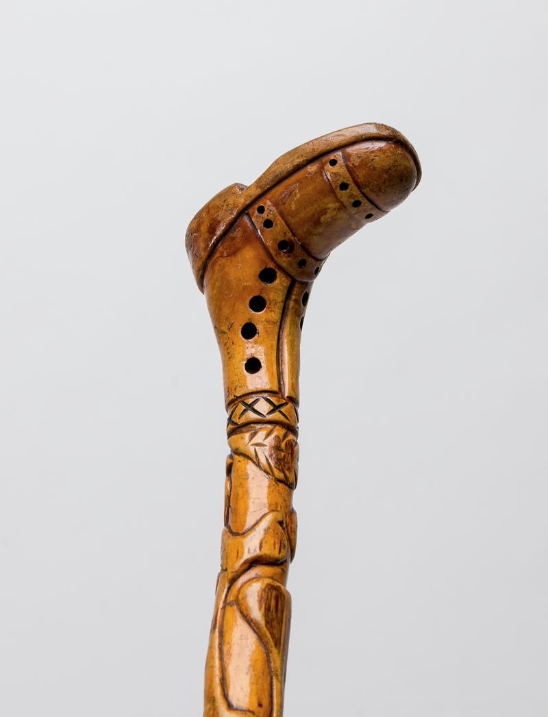 Unpeeled hazel stick with crook handle; varnished; plated brass ferrule