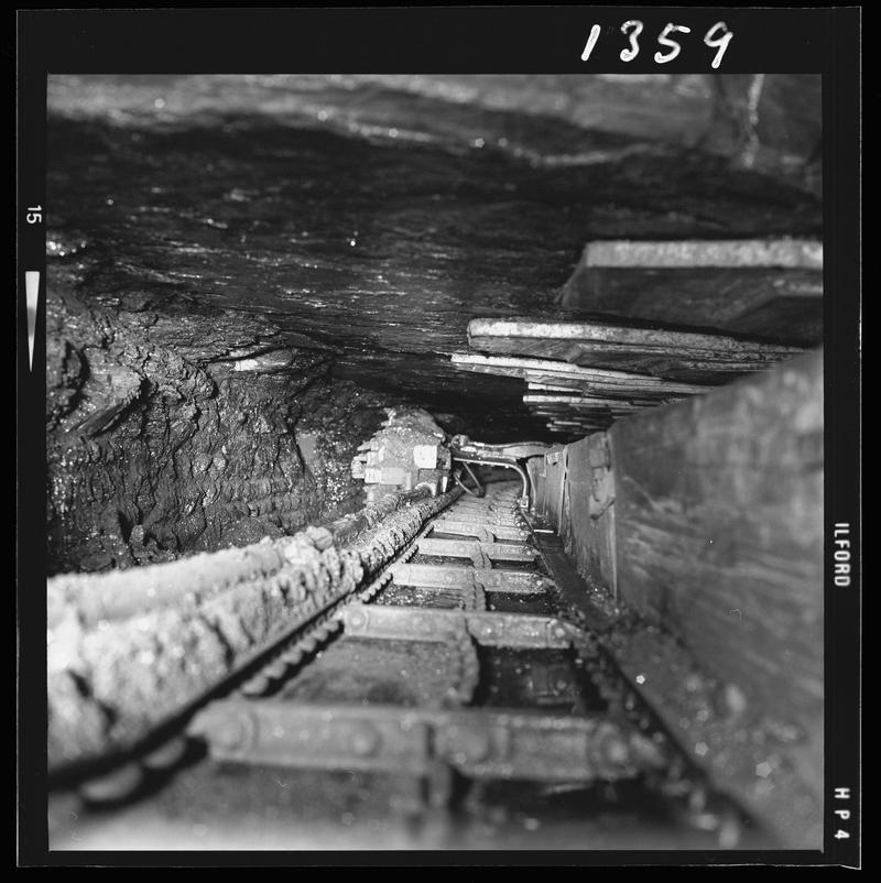 Black and white film negative showing Treforgan Colliery in 1979. Looking across the mouth of the intake with an empty conveyor belt.