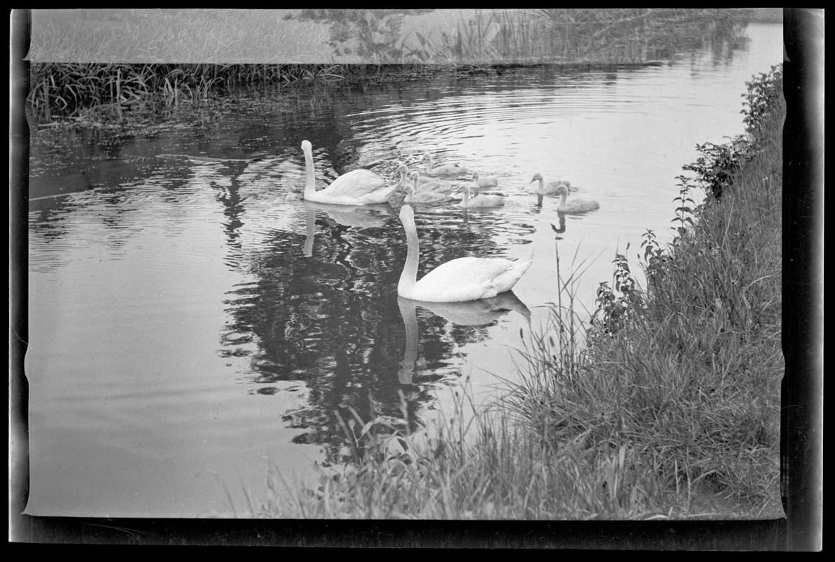 Colour tinted black and white postcard showing view of a man and a horse at the Glamorganshire Canal at Pontypridd.
