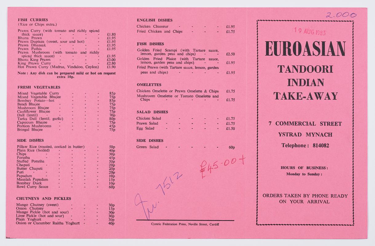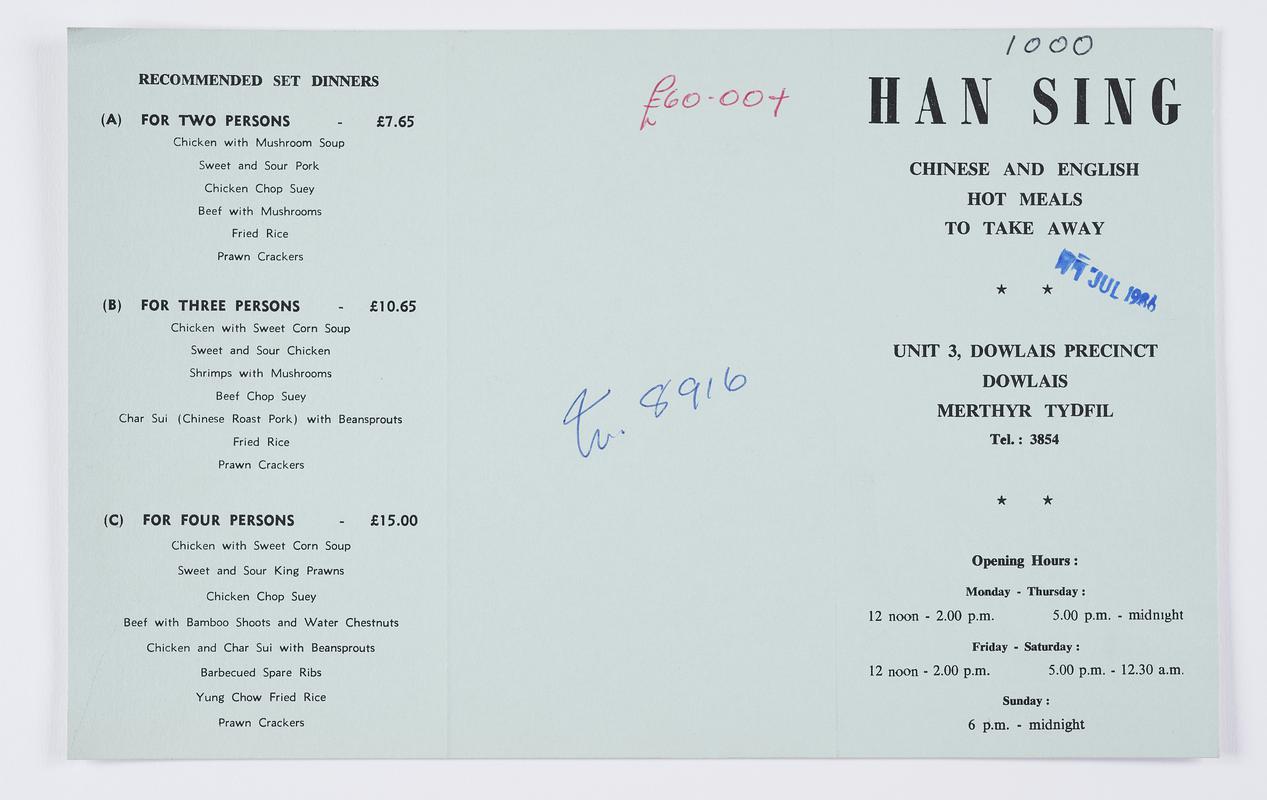 Letterhead printed for 'Bengal Garden' restaurant, Heath, Cardiff. Handwritten order details on the front. Stamped with date 29 July 1981.