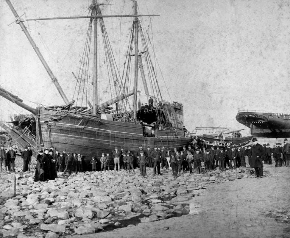 S.S. CASTLE EDEN, 300 feet, net tonnage 1555, at Victoria Wharf, South Wales Public Wharf, Warehouse, and Transit Company, Limited, Cardiff, August, 1888. Mounted on card with red border and description printed below. Photographers stamp on reverse.