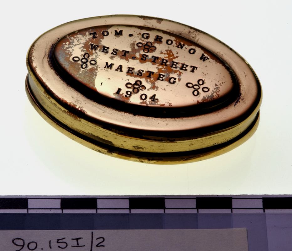 Oval brass twist box with hinged lid on which owner details surrounded by circular pattern and edge has scroll design.