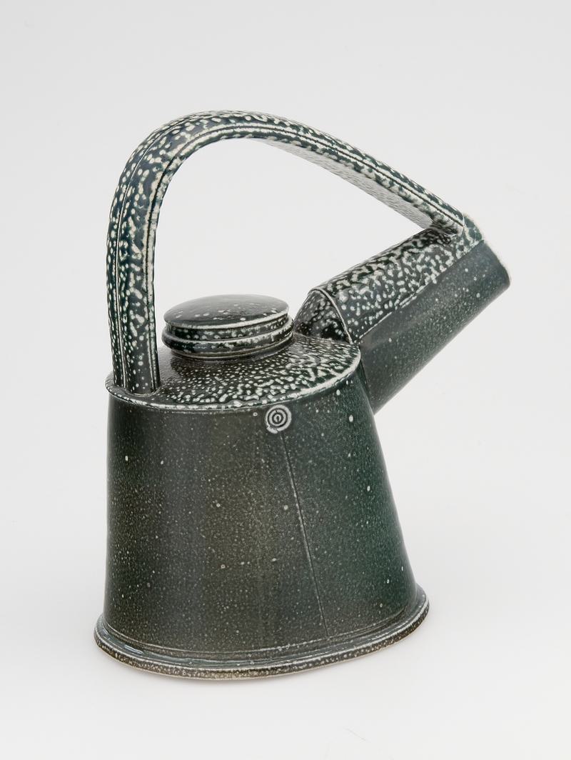 "Walter Keeler is one of the leading studio potters working in Britain. His work is highly individual and energetic, yet remains functional. Keeler’s early career was defined by his radical take on the traditional medium of salt-glazed stoneware. This vibrant yellow teapot with green splashes and brown streaks represents his experimentation with colourfully glazed earthenware during the mid-1990s. This type of glaze is often described as ‘Whieldon’, as it was first developed by Thomas Whieldon in Staffordshire during the 1740s. The spiked 'crabstock' handle and spout introduce an element of danger and play into the notion of functionality. "