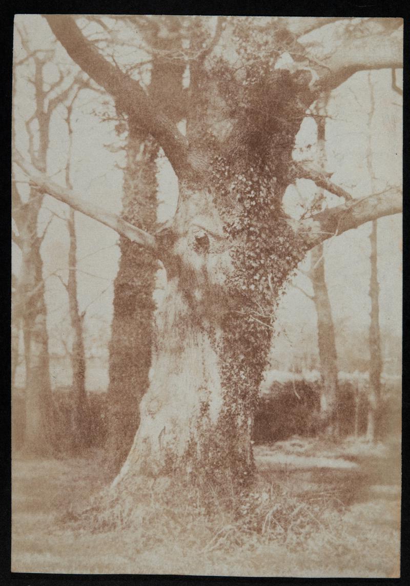Mounted salted paper print. View of trees. All corners of the photograph have been clipped. Black outline on mount around photograph.