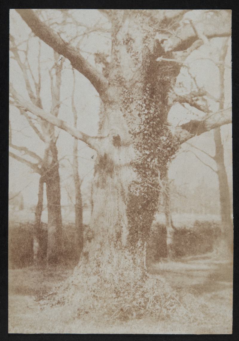 Mounted salted paper print. View of trees. All corners of the photograph have been clipped. Black outline on mount around photograph.