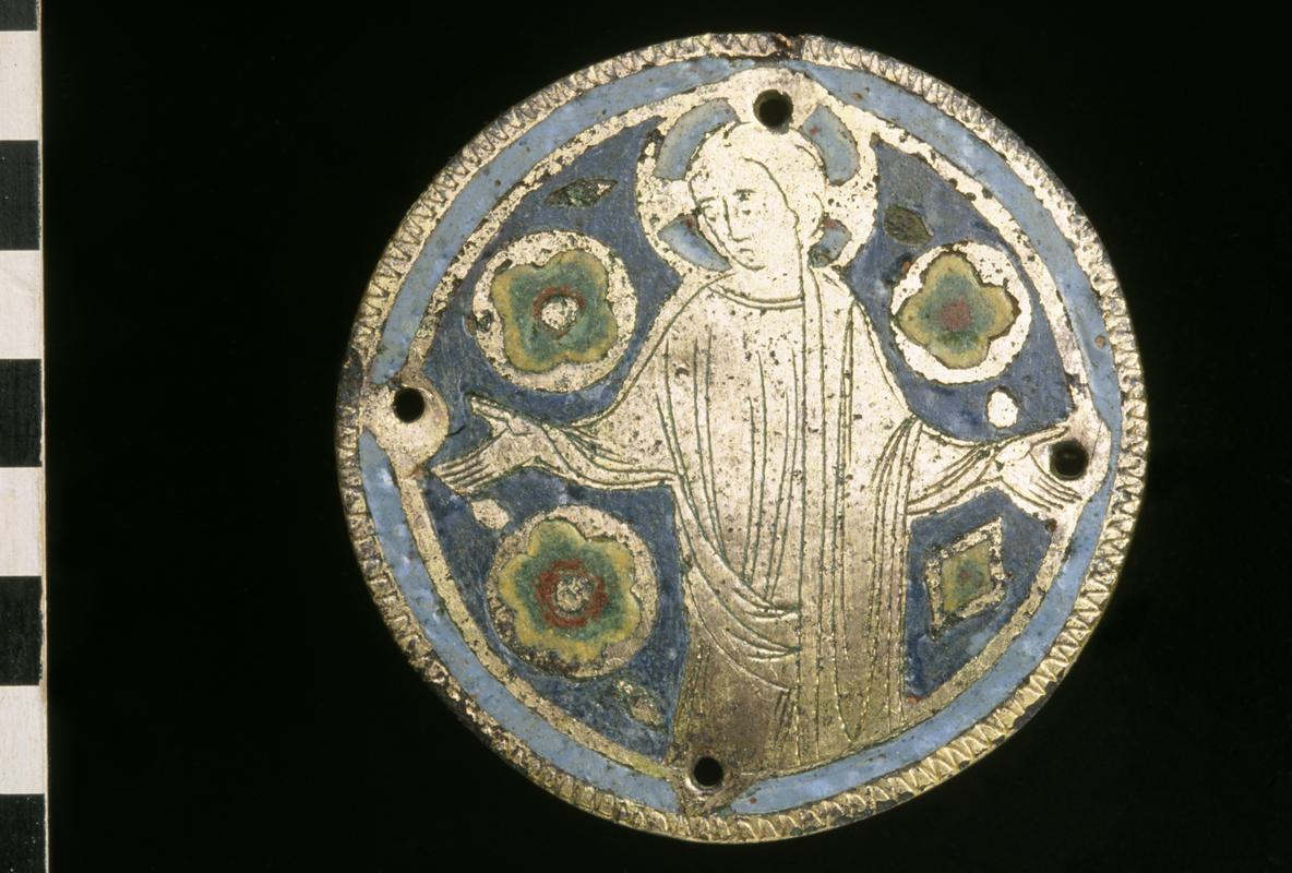 Medieval copper alloy plaque, enamelled
