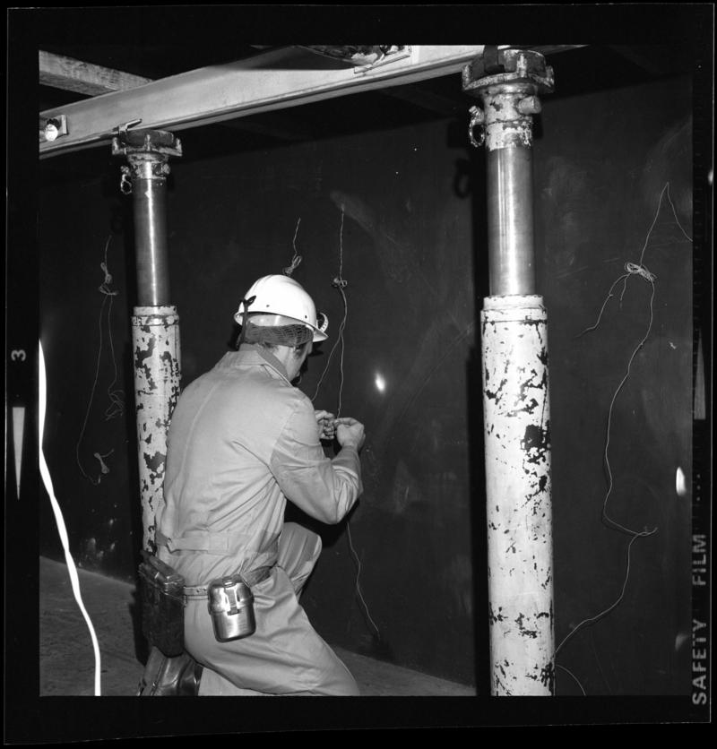 Black and white film negative showing a roadway with high speed conveyor, Blaengwrach Mine, 1 November 1979. 'Blaengwrach 1 Nov 1979' is transcribed from original negative bag.