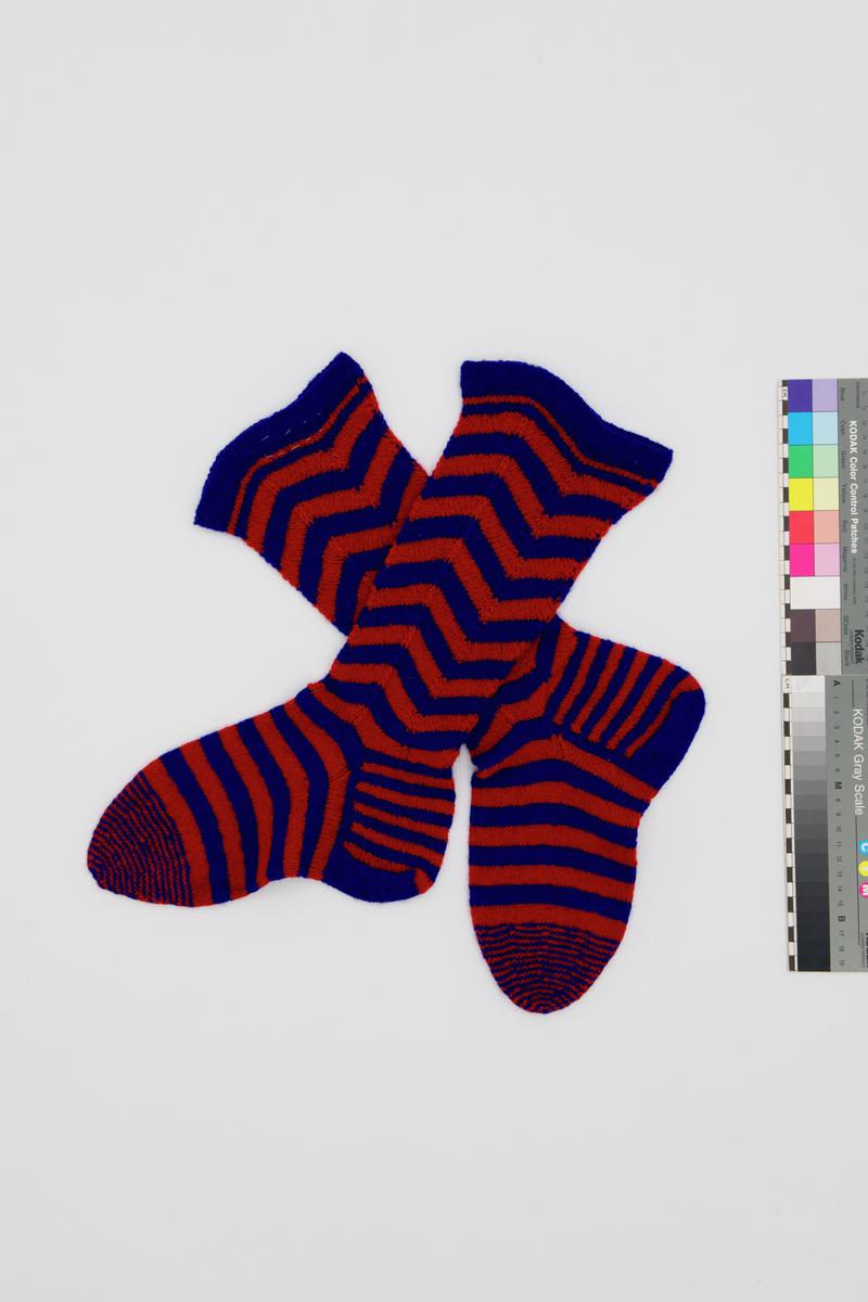 Pair of knitted stockings. Owned and made by Esther David (1821-98). Cream wool with decorative pattern at both sides of ankle ('clocks'), with a 2cm wide decorative band made in contrasting knitting stitches along upper edge.