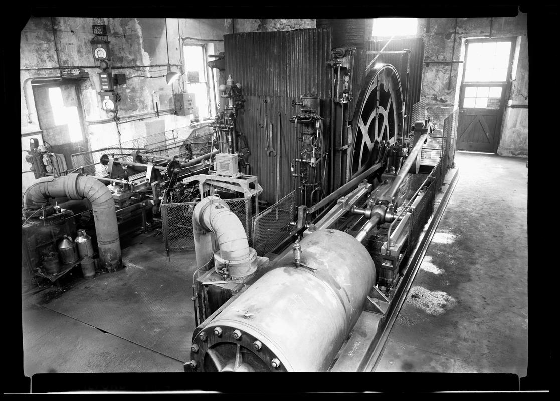 Black and white film negative showing the downcast headgear at Cwmcynon Colliery, 1975. 'Cwmcynon 1975' is transcribed from original negative bag.