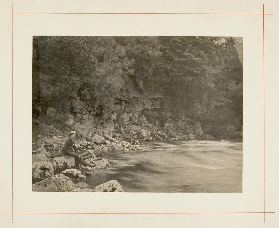 Salted paper print. View of river with bridge across it and unidentified town on the right hand side. Top left corner is clipped.