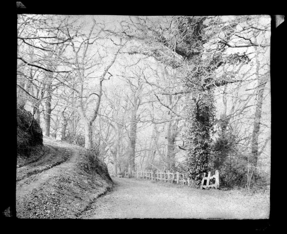 Waxed calotype negative with no tabs. Driveway to Penllergare through wooded landscape.