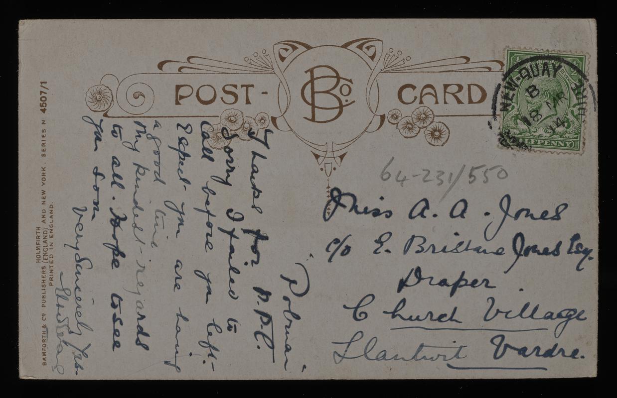 Colour postcard of "Taff Street and Market Street, Pontypridd". Sent to Mrs Jones of New Quay. Postmarked 28 July 1912