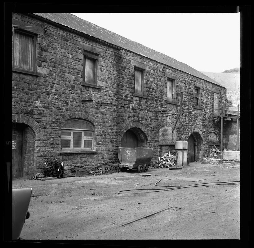 Black and white film negative showing props and bars, Cwmtillery Colliery 25 November 1977.
