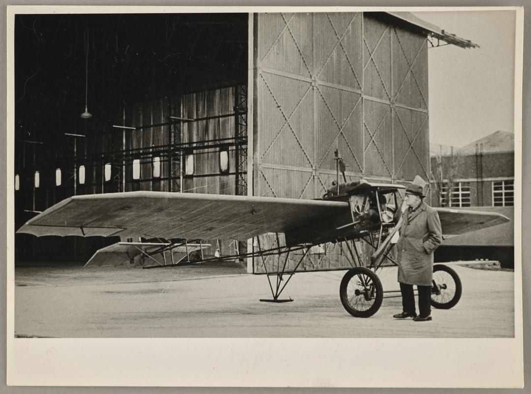 View of a Bleriot type XI plane (the Robin Goch is behind the port wing) on display at R.A.F. St. Athan. Dated 19 Jan. 1984. Neg No. '015/2'.