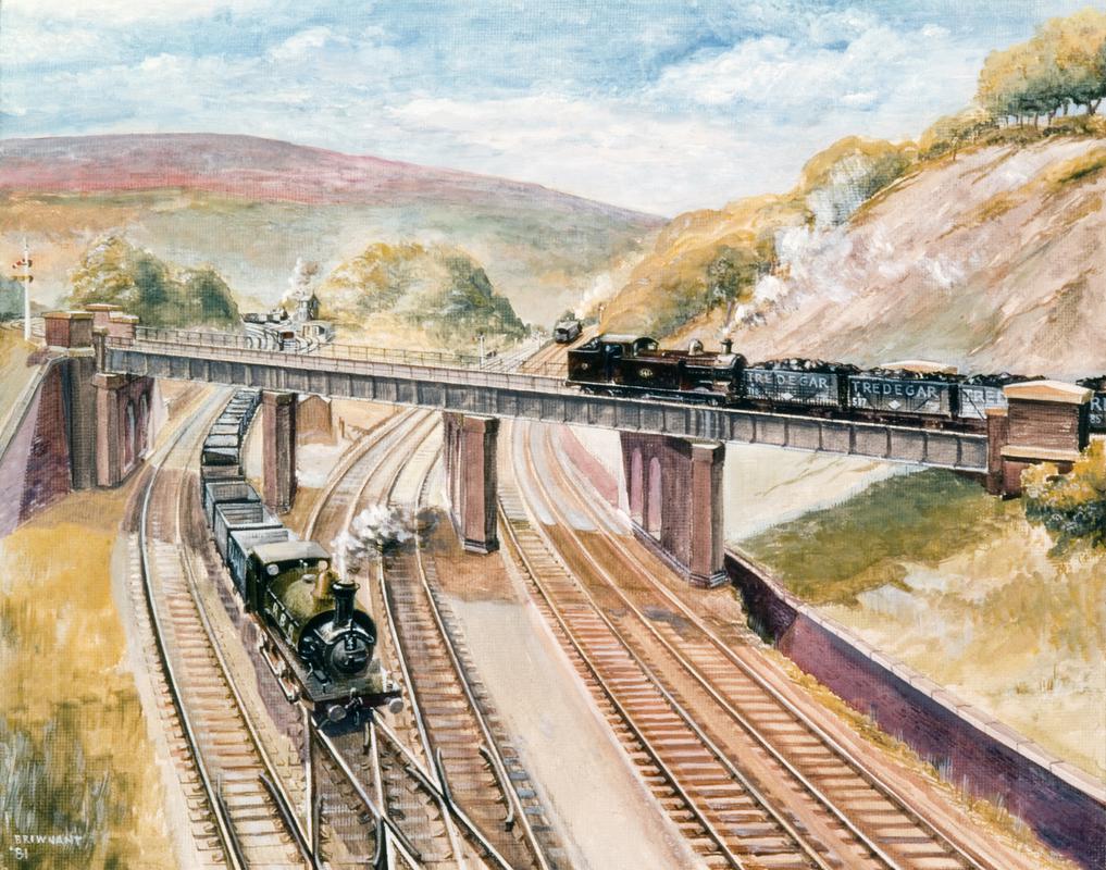Artist note - 'Fishguard bound 4-4-0 no. '4120' ATBARA hurries with it's portion of an Irish Boat Express, whilst 0-6-0ST no. '1601' on a more mundane duty, eases it's load of good West Wales anthracite around the curve and onto the viaduct.' Signed and dated bottom left. Framed.