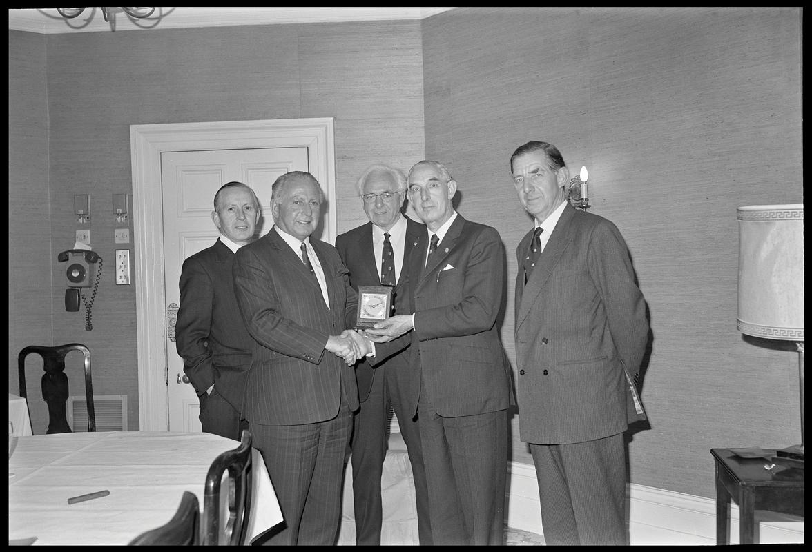 Starboard bow view of H.M.Y. BRITANNIA slowly progressing under her own power through Queen Alexandra Dock, Cardiff, to the sea lock.