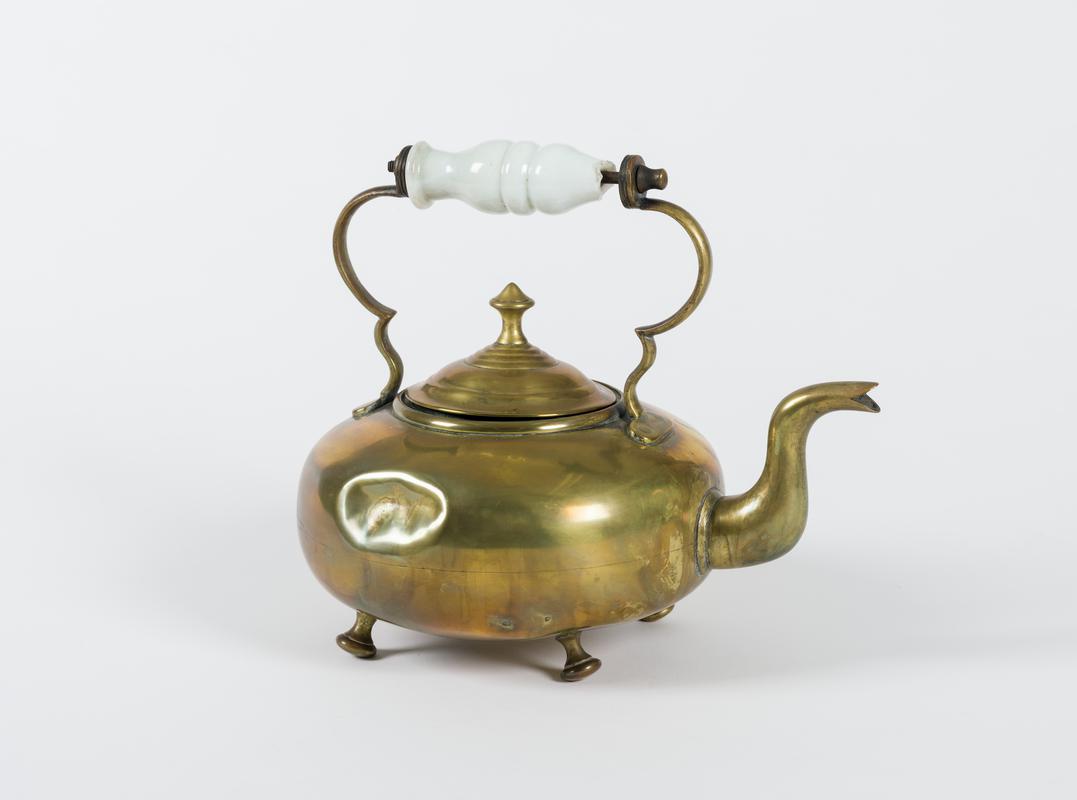 Copper fountain, round body with a brass tap and a long copper spout. Lid and suspension hook for handle missing. Wrought iron handle broken and incomplete.