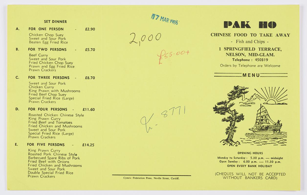 Wine list printed for 'Royal Curry' tandoori restaurant, Canton, Cardiff. Two pages. Handwritten order details on the front. Stamped with date 1979.