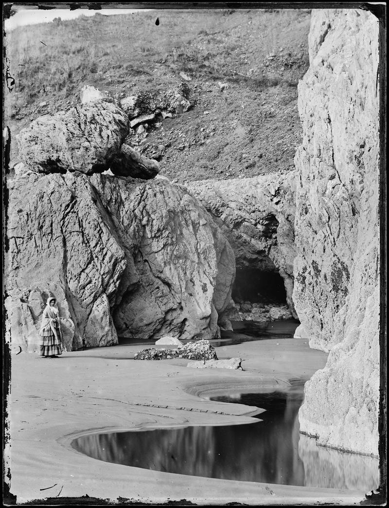 Collodion glass negative. Woodland view showing tree roots in a stream.