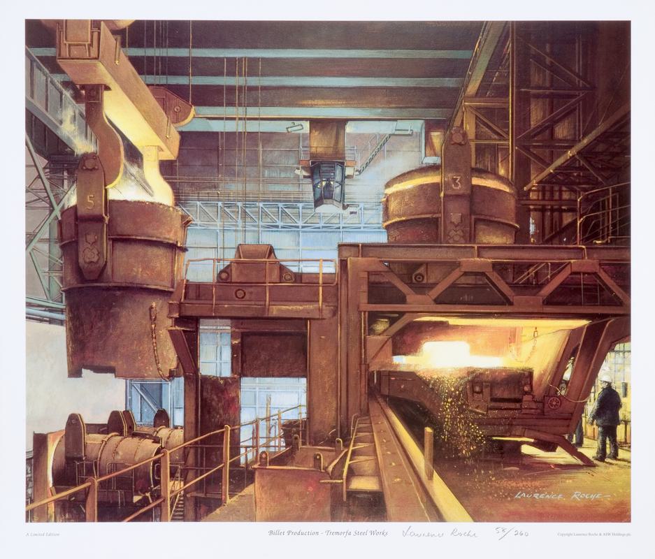 Limited edition colour print (No. 211 of 260) of an original painting showing an interior view of Tremorfa steel works.
