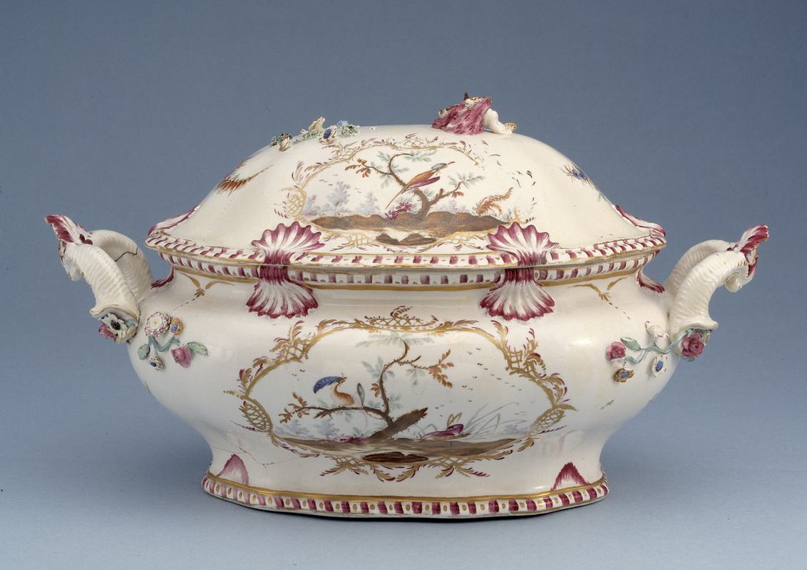 Chocolate kettle, circular, standing on a shallow foot rim, bulging sides, spout with head of crested bird, mahogany bail handle on brass supports, slightly domed cover with applied pear finial; body decorated in polychrome enamels on one side with a spray of mixed purple flowers and a blue flowered sprig, and on the other with a spray of flower, a blue flowered sprig and a purple flowered sprig, spout decorated in green and purple, cover decorated with three miniature sprays arranged in a circle, around painted finial.