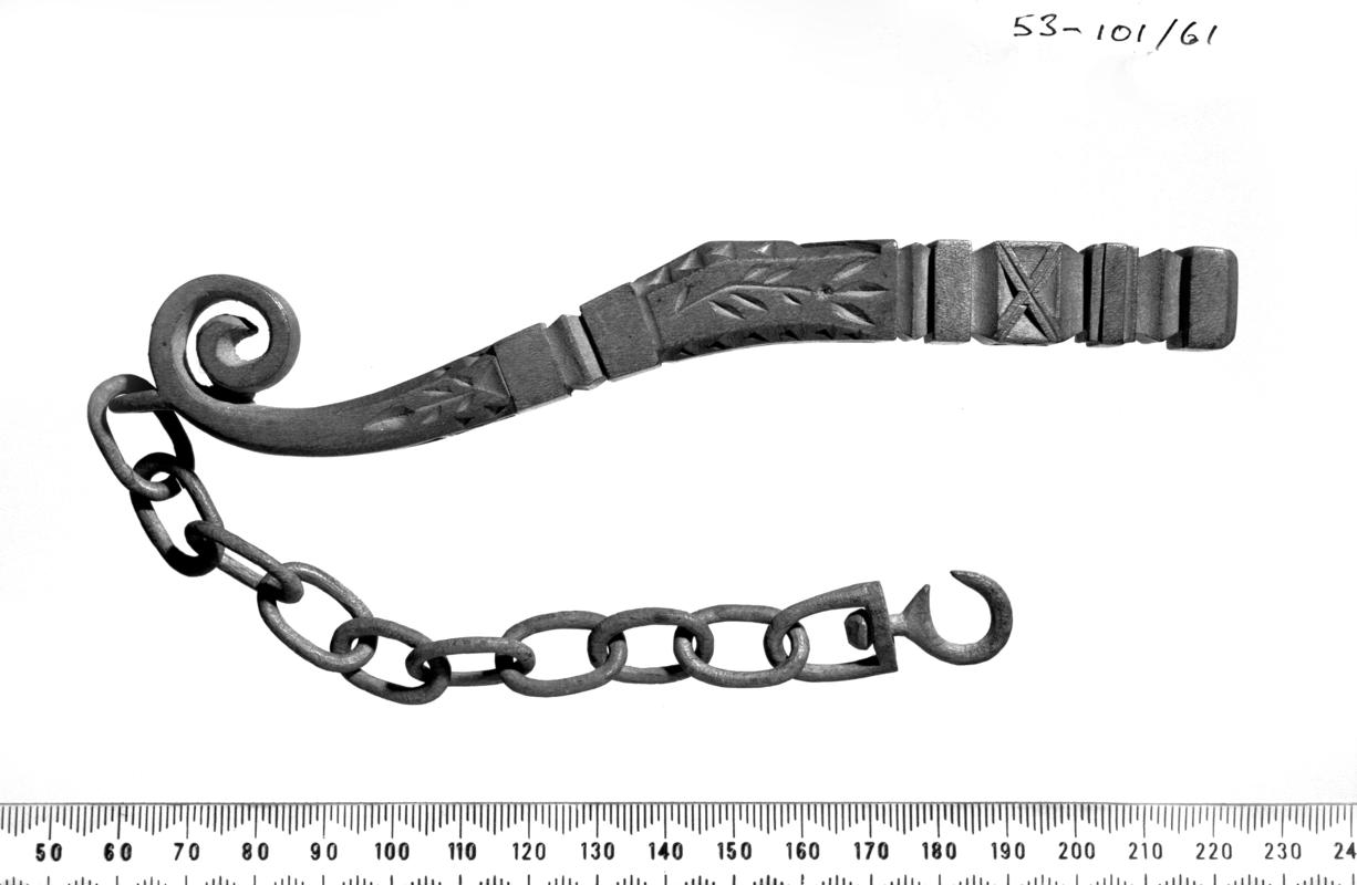 Square wooden tub with a ribbed interior, bolted on to four wooden legs. Two side lats for handling and a wooden, pivotted frame on one side. Cast iron gearing mechanism operated by a wooden lever handle, attached to wooden lid, to rotate the metal-framed dolly (with six wooden pegs) with a reciprocating movement. Wooden lid held in position with two metal buttons. Metal draining spout with wooden bung towards base of tub.