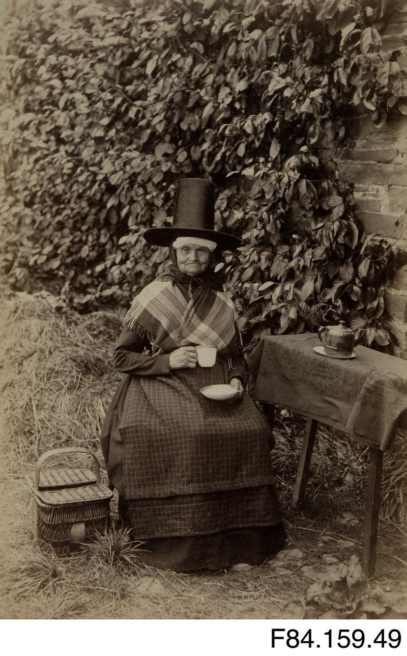 Mounted photograph of a print entitled "A Welch Peasant and his Wife". Distributed to commemorate the French Invasion of Fishguard in 1797. The print depicts a man with a round crowned hat, short jacket, waistcoat, kneebreaches and stockings. The woman wears an identical hat, checked gown, arpon and red cloak. The man carries a scythe, and the woman a pitchfork.