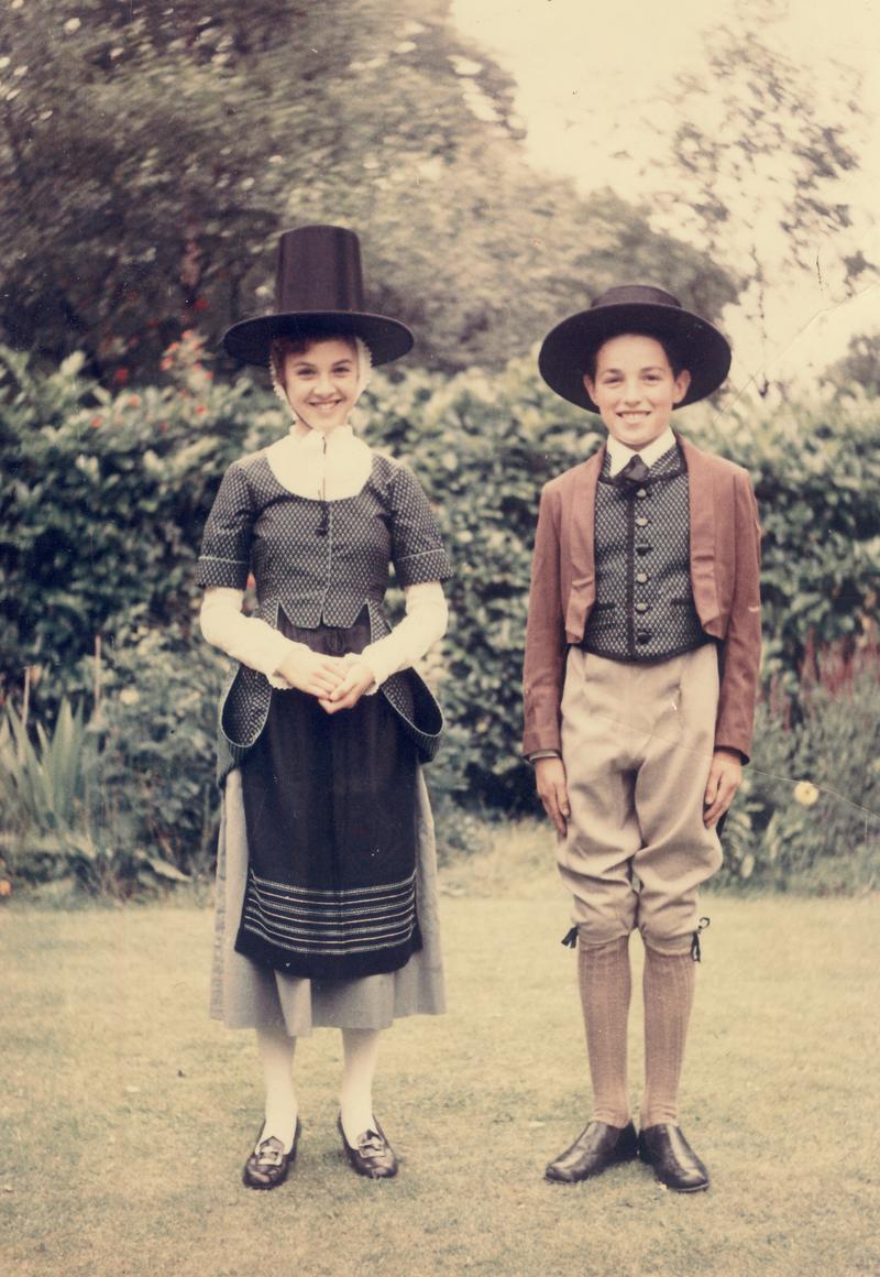 Mounted photograph of a print entitled "A Welch Peasant and his Wife". Distributed to commemorate the French Invasion of Fishguard in 1797. The print depicts a man with a round crowned hat, short jacket, waistcoat, kneebreaches and stockings. The woman wears an identical hat, checked gown, arpon and red cloak. The man carries a scythe, and the woman a pitchfork.