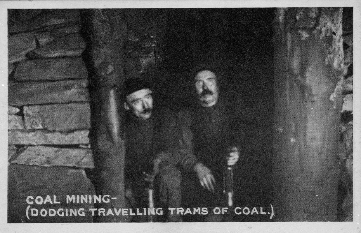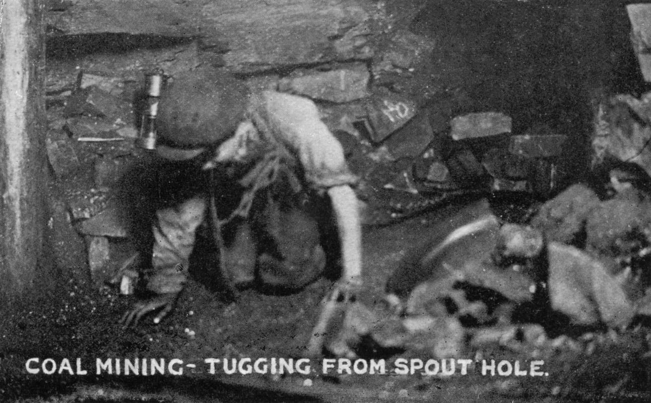 Black and white photograph showing young boy pulling a sled loaded with coal, from a narrow seam. From a set of photographs (Twelve Photo-tone Postcards), 'COAL MINING' published by M. Brookes, 15 & 15a West Street, Pontypridd. Unused, but short message on reverse.