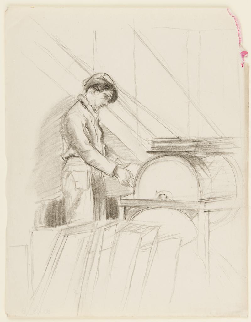 Preparatory pencil sketch/drawing showing a rolling mill in action.