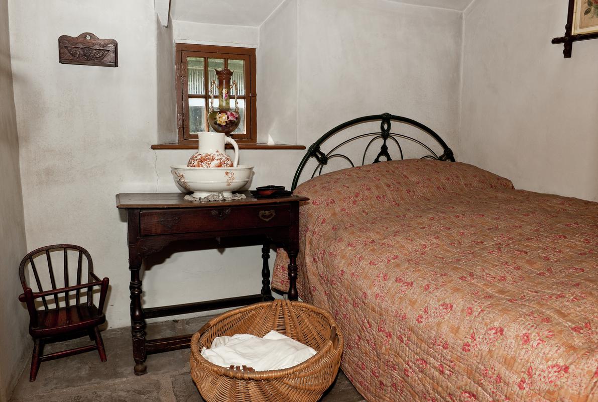 Foot board with top rail for canopy, only lower half panelled (one panel missing). Bedstead has no canopy, one top side rail missing, one lower side rail destroyed because of dry rot.