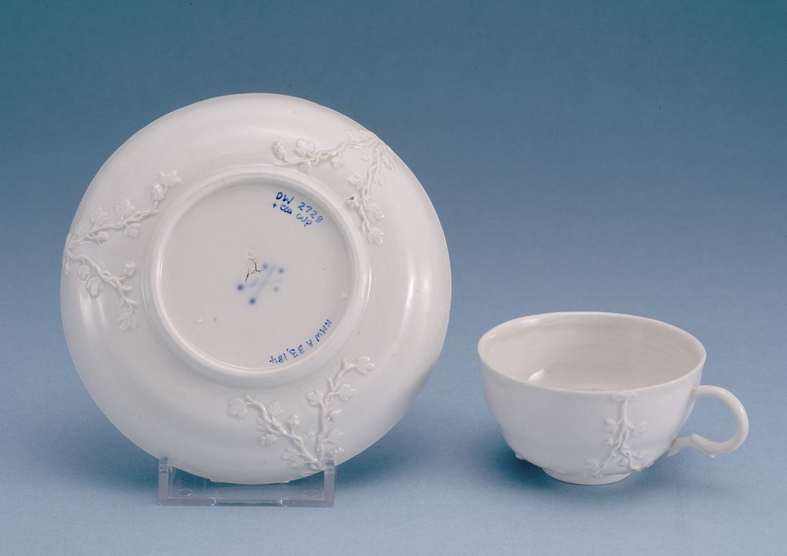 Coffee cup and saucer, hard-paste porcelain, cup standing on a foot rim, tapering inwards at base, scroll handle; decorated opposite the handle with a male figure in a landscape wearing a pink/orange jacket and knee hights, holding a stick, one foot behind the other, one arm outstretched, trees and bushes behind, scene standing on a purple, curved platform with scrolling and patternwork, one purple sprig and a single leaf one side of the handle, an orange sprig on the other side, purple border line to lip. Saucer standing on a foot rim, spreading sides; decorated in the centre with a female figure in a yellow dress with a white apron, right arm outstretched, trees and bushes behind, scene standing on a purple, curved platform with scrolling and patternwork, surrounded by three flower sprigs and four leaves, purple line border to lip.