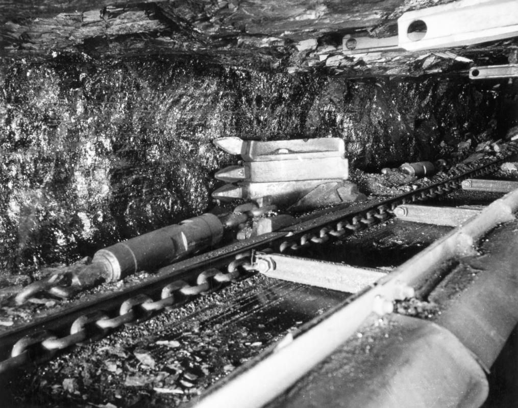 Huwood TB200 conveyor at Hafodyrynys Colliery. Photographers details stamped on reverse. Typed paper label stuck to back and folded over front.