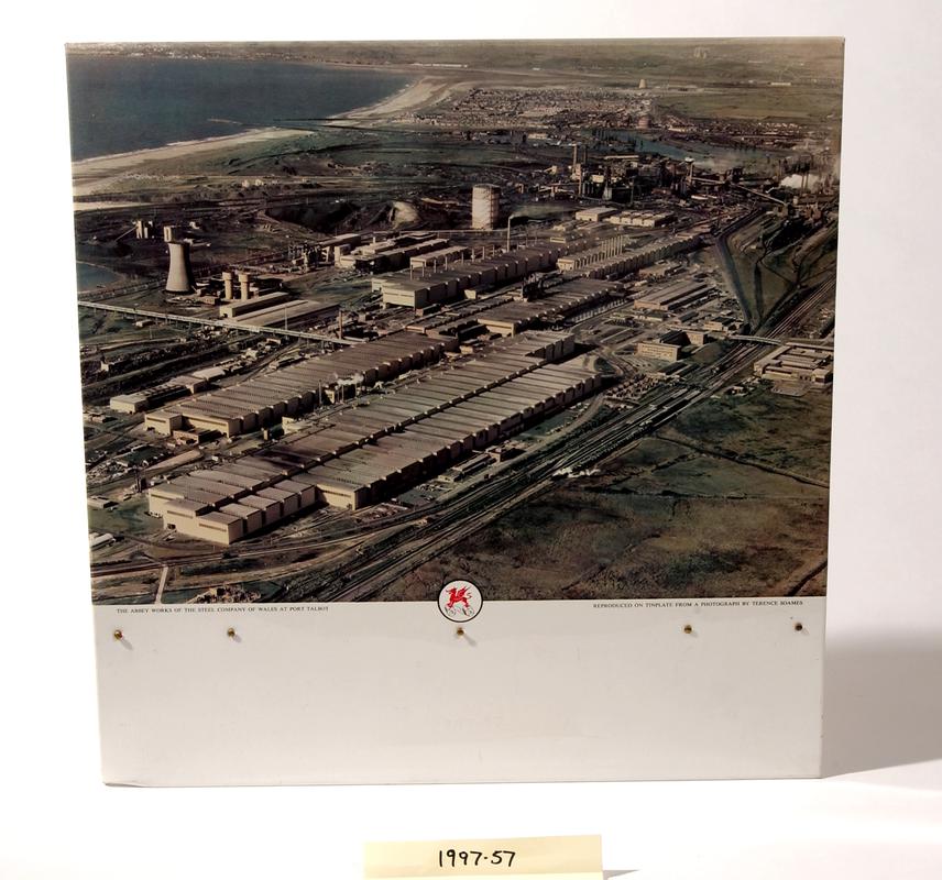 Mr G.C.R. Eley, Chairman of Richard Thomas and Baldwins Ltd, giving a speech during the Royal opening of RTB's Spencer Works, Newport, 26 October 1962. The Queen is sat beside him. Photographer's stamp and yellow RTB label on the back of photograph.