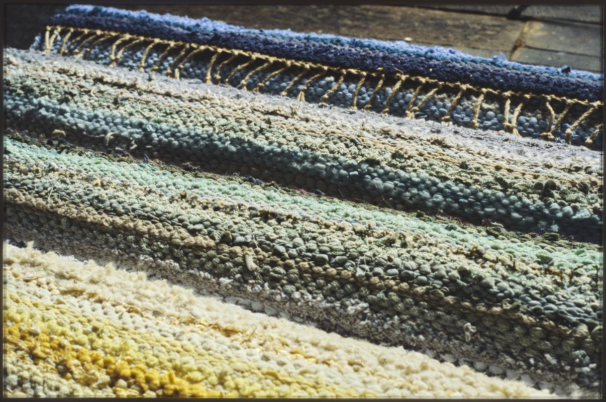 Rag rug sample (woven). Weft woven from various fabrics in stripes of black, brown, red, blues with warp of undyed linen cord, finished in a plaited tassel in two corners.