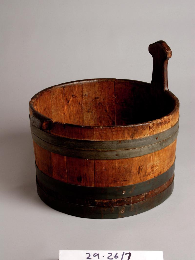 milk pail for use with bucket-type milking machine; round container with short, straight-sided neck; widens gradually from 19.8cm at the neck to 32.2cm, then straight sides to base; 1.3cm wide rib 5cm from base; four legs shaped from bottom edge of main body; base welded to main body; two short, thick rubber rings on the handle