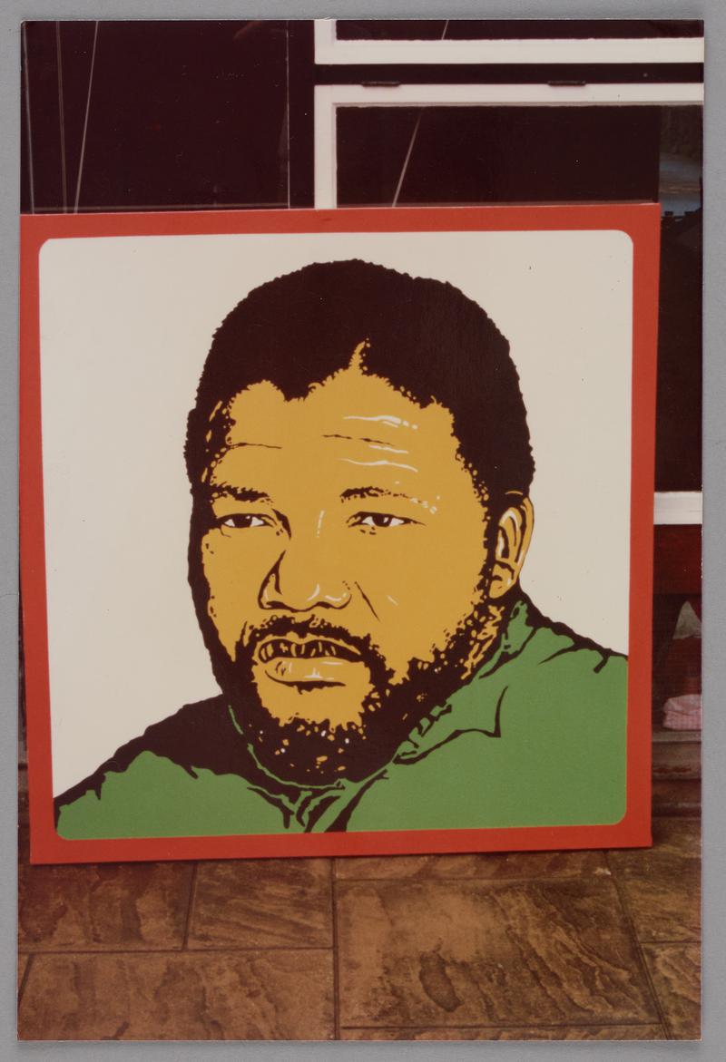 Banner of the Cardiff branch of the Anti-Apartheid movement. Painted in about 1977 by Gerda Roper at her home in Barry Island. Oil on canvas featuring a group of 10 people on a blue background. Above is the inscription 'ANTI-APARTHEID' in blue and 'CARDIFF WALES' in red lettering.