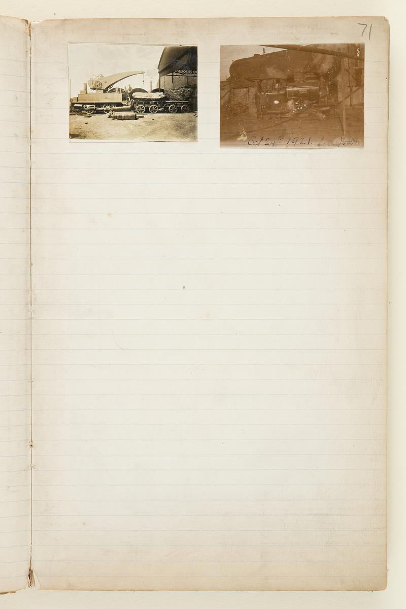 Photograph in top right hand corner of page 71 of steam locomotive JOAN. "Oct 24 1921 Loco Joan", handwritten in ink, along bottom edge of print.