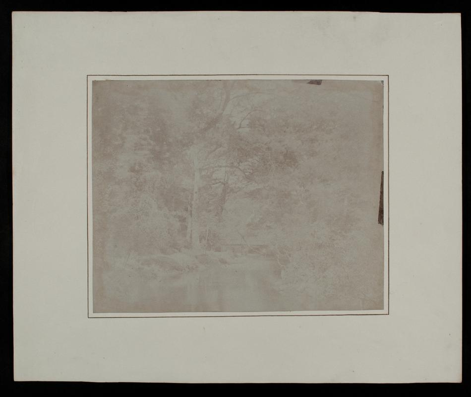 Salted paper print. Close up of bridge with steps at left and rowing boat tied up.