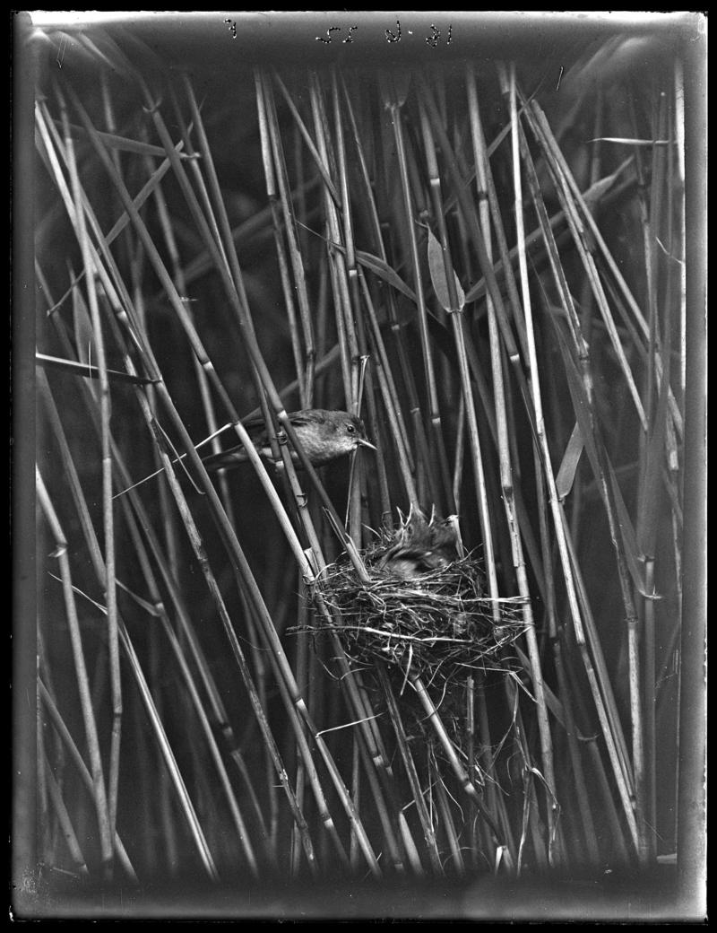 A Reed Warbler (Acrocephalus scirpaceus) nest with young, Morfa Ponds, Margam (Site of old colliery pools now under Port Talbot steel works). Photographed 18 June, 1922.
