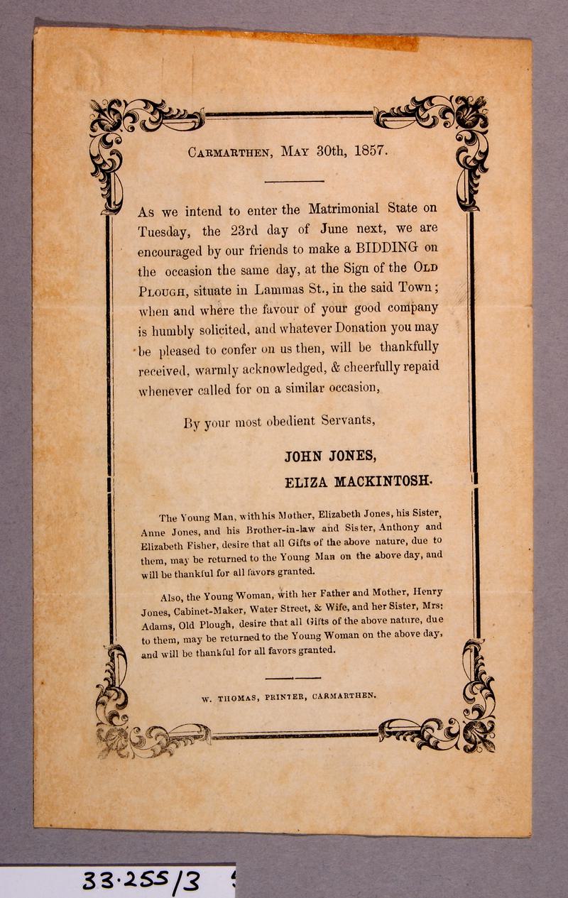 Letter from M.A. Hoptrough (Harrogate) concerning the custom of cwinten in Sully, Glamorgan - "... we the village lads held up the bridal party after the wedding & they were not allowed passed, until the bridegroom had paid a toll ..." [1959] A copy of T.M.O.'s reply is attached.