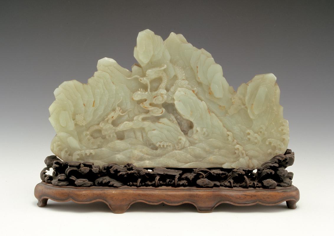 Sword, grey- green jade formed as broad pointed blade, with the flat surface decorated in gilt with dragons, with elaborate wooden stand.