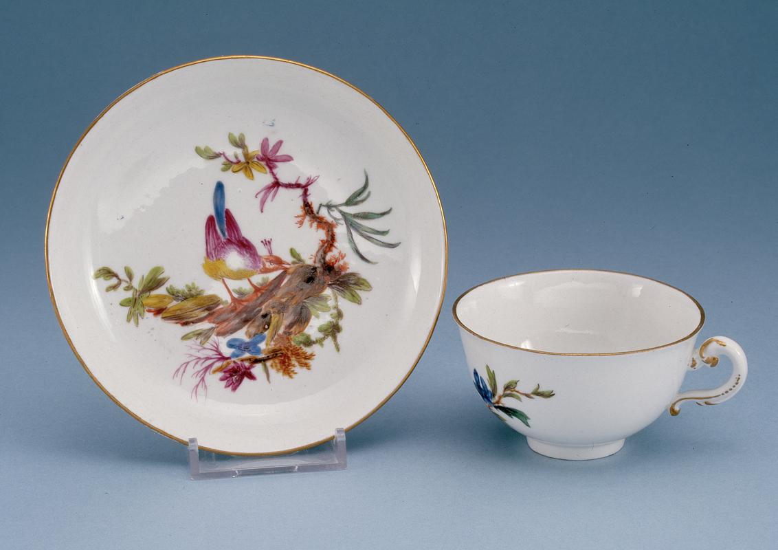 Tea cup and saucer, cup hemispherical, standingon a foot rim, flared sides, everted lip, floriate C-scroll handle; painted in polychrome enamels, opposite the handle with an exotic bird in brown, yellow, red and puce, standing on a pile of stones, a branch with red blooms issuing to right, and another with blue flowers to left, gilt border line to lip, gilding to handle, green ermine tail painted inside. Saucer, standing on a foot rim, spreading sides, everted lip; painted in the centre with a bird in a similar palette, perched on a pile of stones, amid foliage and flowers, a branch behind with green and purple foliage and yellow fruit, gilt border line to lip.