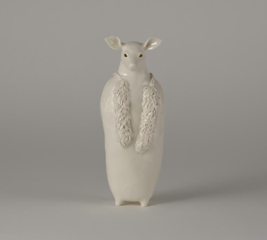 Figure, zoomorphic, soft-paste porcelain with clear glaze, the head in the form of an owl, the body simple and oval in form, standing on four squat feet; applied stylised feather forms to the shoulders and around the body, the entire body is pierced with small circular piercings in an asymmetric manner, the head and neck has applied overlapping scale-like feathers, the eyes are pierced.