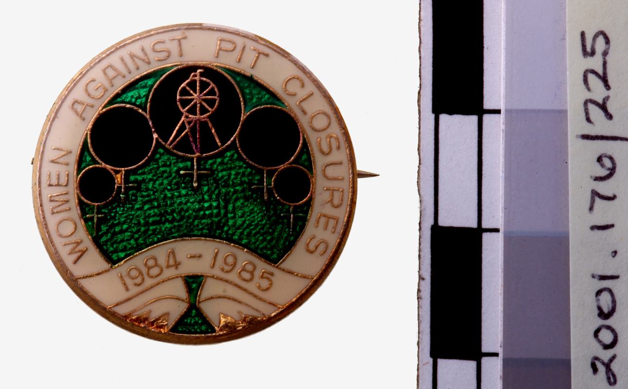Circular gold coloured metal badge with design, headgear and spires, set in blue enamel with inscription set in purple enamel. Clasp attachment on reverse.