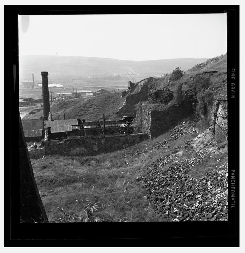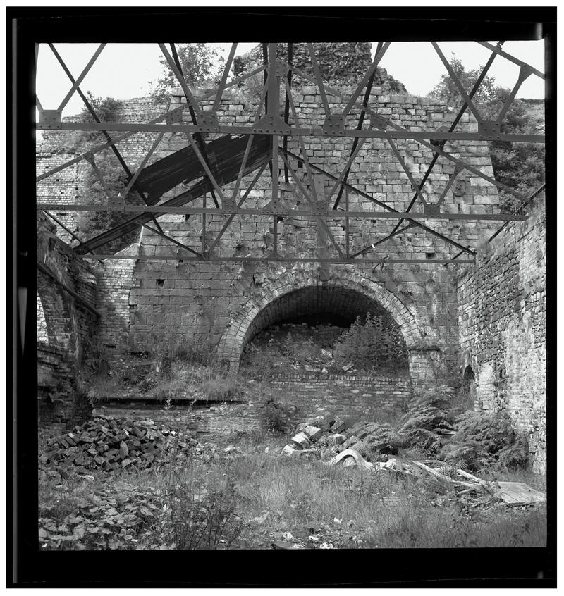 Ruins of Blaenavon old side iron works, showing the top of the No.2 blast furnace viewed from the top of the No.4 blast furnace. Looking south west.