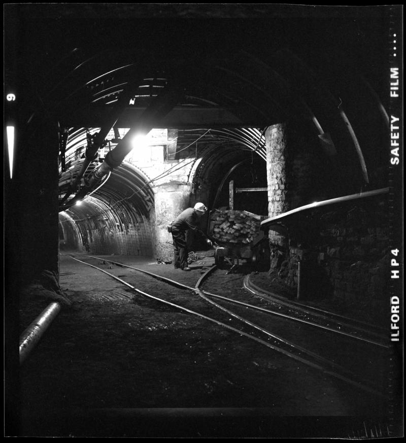 Skip at pit bottom, Lady Windsor Colliery. National Coal Board stamp on the reverse.