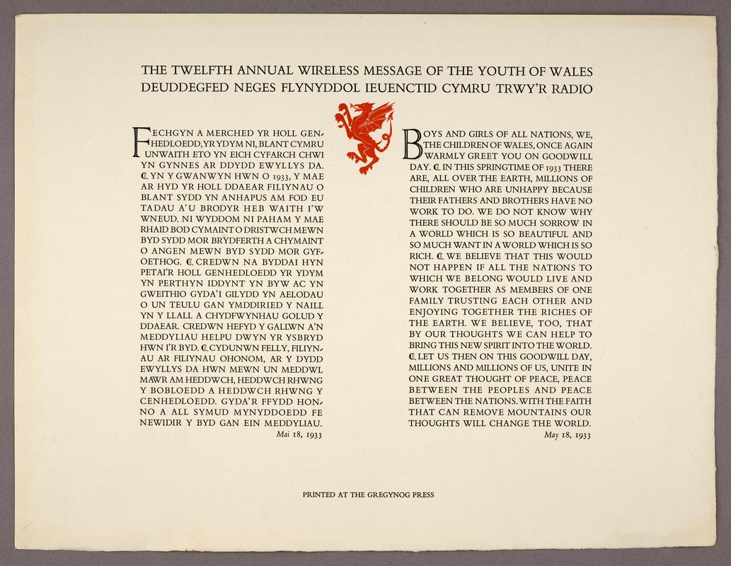 Printed peace message, titled 'DYDD EWYLLYS DA XVII GOODWILL DAY / 18 MAY 1938 MAY 18 / NEGES FLYNYDDOL PLANY CYMRU TRWY'R RADIO I'R BYD / ANNUAL WORLD WIRELESS MESSAGE OF THE YOUTH OF WALES.