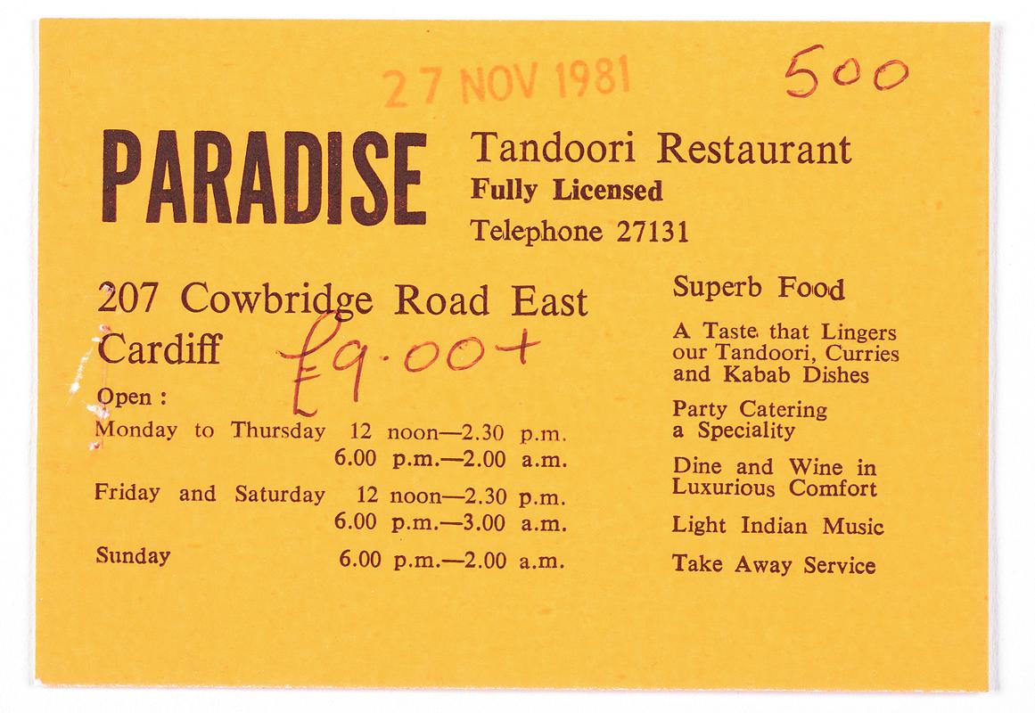 Business card printed for 'Joe Nifield, Collector and Shammas for Cardiff United Synagogue'. Handwritten order details on the front. Stamped with date 29 November 1984.