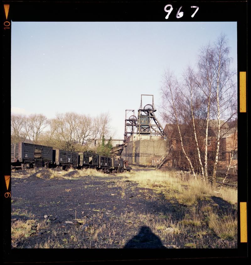 Surface view showing the capped shaft of Engine Pit, Blaenavon, and the remains of an early pumping arrangment, 1974. National Coal Board and photographer's stamp on the reverse.
